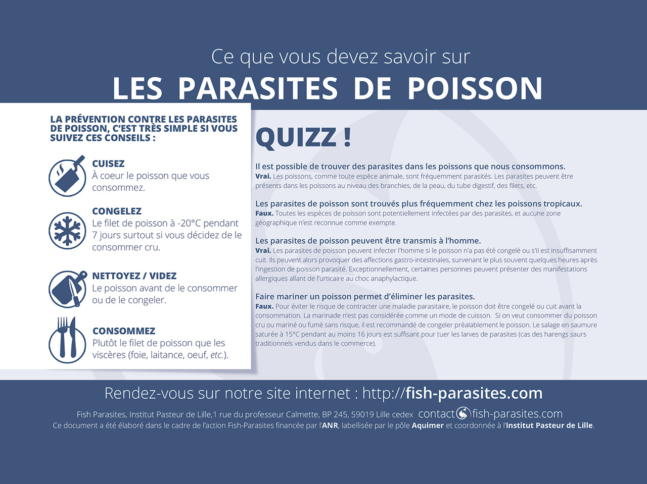 • L'éviscération du poisson est conseillée avant de le cuire ou de le congeler. Elle doit être pratiquée le plus tôt possible après capture du poisson. Cela diminue le risque de migration des larves qui sont éventuellement présentes dans le tube digestif vers les filets qui seront consommés. Mais l'éviscération n'annule pas complétement le risque parasitaire car les larves peuvent être préexistantes dans les filets.