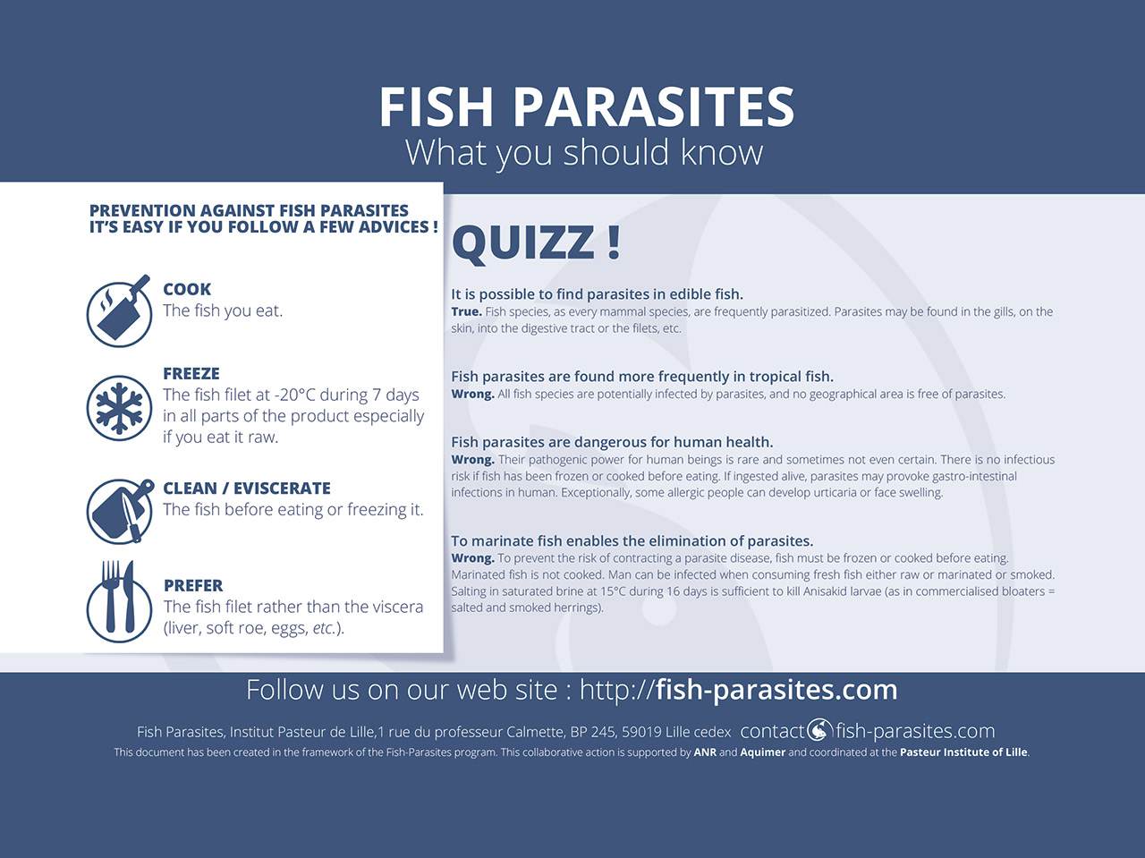 • The fish evisceration is recommended before cooking or freezing. Evisceration should be done as soon as possible after fishing. This procedure diminishes the risk of larvae migration. Indeed, larvae that may be present in the fish digestive tract can migrate in the fillets after the death of the fish. But the evisceration does not completely prevent the parasite risk because larvae can also be present into the fillets before catching the fish.